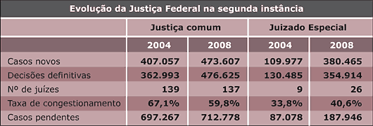 Ao todo, em 2008, circularam 5,5 milhões de processos na Justiça Federal, tanto na Justiça ordinária quanto nos Juizados Especiais Federais e Turmas Recursais. Somente no primeiro grau da Justiça ordinária, o número de processos novos no ano passado foi de 617,4 mil. Houve uma queda, levando em consideração que, em 2007, os 646,4 mil ajuizamentos foram o recorde dos últimos quatro anos. Já em segunda instância, a quantidade saltou de 407 mil, em 2004, para 473,6 mil, em 2008 — um aumento de 16,3%. A pesquisa mostra, porém, que o número de pessoas atendidas pela Justiça Federal hoje é 10% menor que em 2004. Foram 2,06 milhões de pessoas atendidas há quatro anos e 1,86 milhões no ano passado.