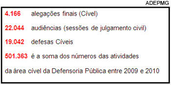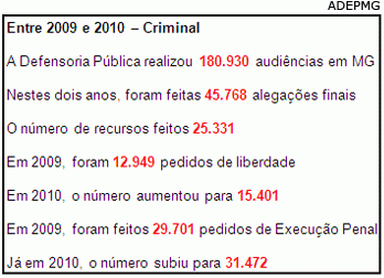 "As Defensorias Públicas estão atuando como nunca antes na história do país". A afirmação é do presidente da Associação dos Defensores Públicos de Minas Gerais, Felipe Augusto Cardoso Soledade. Ele faz questão de mencionar os números. Somente em Minas, entre 2009 e 2010, 22.044 audiências de julgamento civil foram feitas. Foram atendidas 523 mil pessoas. E ainda: 82.281 petições iniciais foram elaboradas. Ao todo, os defensores públicos atuaram em mais de 1,7 milhão de casos. O estado tem 15 milhões de mineiros de baixa renda. Para a Defensoria, muitos ficam sem atendimento por falta de conhecimento sobre seus direitos ou até mesmo de profissionais.