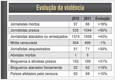 Em 2011, 66 jornalistas foram mortos — um crescimento de 16% em relação a 2010, e a quarta maior cifra de mortes desde 1995. Na esteira da Primavera Árabe, o movimento de contestação aos regimes ditatoriais no Oriente Medio, 20 desses profissionais morreram naquela região. E mais: outros 18 morreram na América Latina. Os números podem ser encontrados no levantamento feito pela organização não-governamental Repórteres sem fronteiras, que elenca os dez lugares do mundo que representam casos extremos de censura à mídia e de violência contra a classe.