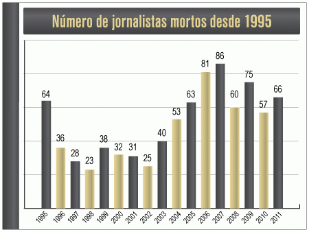 O levantamento traz outros dados, todos referentes ao ano de 2011. Em doze meses, 1.044 jornalistas foram presos, 1.959 foram fisicamente atacados ou ameaçados, 71 foram seqüestrados e 73 fugiram de seus países. Ao mesmo tempo, acontecem 499 censuras contra a mídia. Confira a evolução do número de jornalistas assassinados a cada ano, desde 1995: