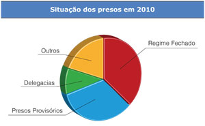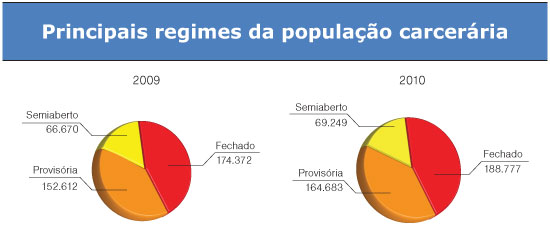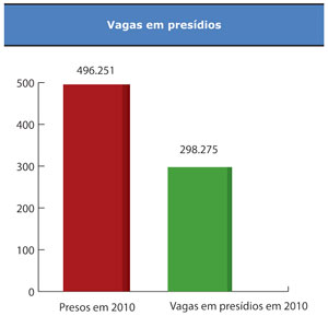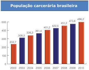 A população carcerária mais que dobrou nos últimos dez anos. Saiu de 233 mil presos, em 2000, para 496 mil no ano passado – um salto de 113%. Segundo dados do Departamento Penitenciário Nacional (Depen), do Ministério da Justiça, só entre 2000 e 2005, a quantidade de encarcerados subiu para 361 mil, um aumento de 55%. Enquanto isso, o índice de homicídios país passou de 28,9 em cada grupo de 100 mil habitantes, em 2003, para 25,6, em 2008 (dado mais recente). Nos últimos anos, a taxa tem permanecido em torno de 26 mortes em cada 100 mil habitantes.