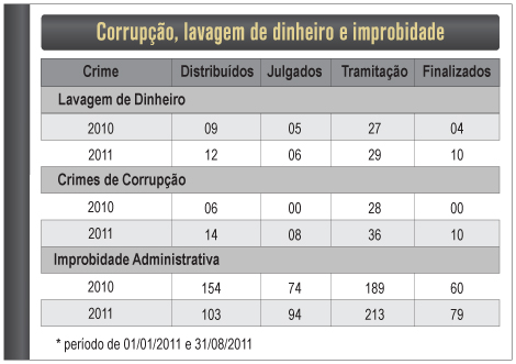 Das ações julgadas pelo Supremo, até agosto de 2011, 94 foram sobre improbidade administrativa, oito sobre crimes de corrupção e seis sobre lavagem de dinheiro. Durante todo o ano de 2010, esses números ficaram em 74 processos de improbidade, nove de corrupção e cinco de lavagem de dinheiro. O porcentual desse tipo de ação que transitou em julgado, sem possibilidade de recursos, supera em 40% todo o ano passado. O total desses processos distribuídos em 2010 chegou a 178, contra 129 que já ingressaram no Supremo até agosto último.