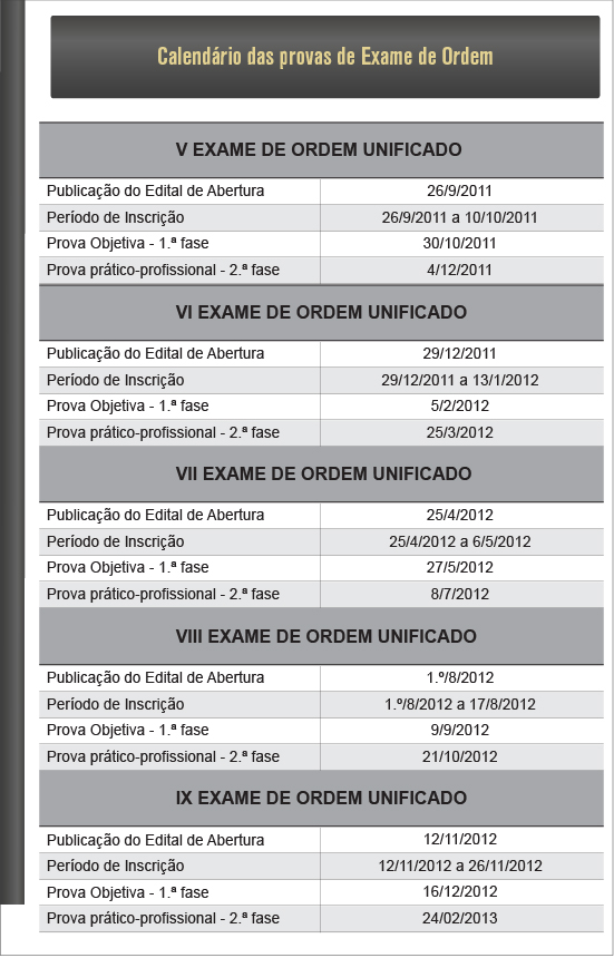 O Conselho Federal da Ordem dos Advogados do Brasil (OAB) divulgou, nesta sexta-feira (14/10), um calendário indicativo completo (veja a tabela) sobre as próximas edições do Exame de Ordem Unificado. O calendário contém todas as datas dos processos (publicação de edital de abertura, período de inscrição, prova objetiva e prova prático-profissional), de agora até o final da gestão da atual Diretoria da entidade, em fevereiro de 2013.