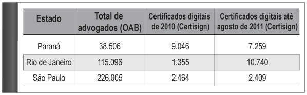 Já São Paulo, pelos dados da Certisign, é praticamente um estado no papel. Dos 226 mil advogados registrados na OAB, apenas 5,9 mil têm a certificação da companhia. Ou seja: 89% dos advogados paulistas não têm condições de peticionar eletronicamente.