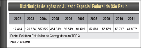 Mesmo atendendo, em média, 611 pessoas por dia sem o auxílio de um advogado, o Juizado Especial Federal da 3ª Região (São Paulo e Mato Grosso do Sul) tem, em cada dez ações, oito com um defensor cadastrado. O número mostra que, apesar de ter nos Juizados a facilidade de dispensar o advogado, a população ainda prefere contar com ele mesmo nas pequenas causas. São competência dos JEF causas em que figuram como parte órgãos da União e que tratam de valores de até 60 salários mínimos.
