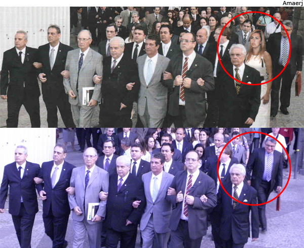 Intrigado, o atual presidente da Amaerj, Antônio Cesar Siqueira – que aparece no centro das duas fotos de braço dado com o presidente da AMB, Nelson Calandra – mandou um comunicado ao paresidente da AMB, desembargador Nelson Calandra, pedindo explicações para o fato de Renata Gil estar onde ela não estava. A nota, que pode ser lida no site da Amaerj, reclama que a juiza-candidata aparece em outras sete fotos no AMB Informa.