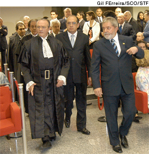 A informatização e a transparência dos números do Judiciário foram os projetos mais visíveis das gestões de Asfor Rocha. Sob sua direção no STJ, contudo, o tribunal passou por mudanças estruturais menos estrondosas, mas tão importantes quanto as mais visíveis. Foi durante a Presidência do ministro que ganhou força a chamada Lei dos Recursos Repetitivos, aprovada meses antes de sua eleição para o comando do tribunal, em 2008. (Foto: Asfor Rocha ao lado do presidente Lula,e seguido pelo presidente do Supremo Gilmar Mendes, no dia da posse na presidência do STJ)
