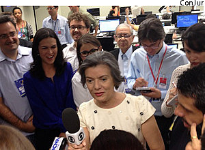 A conversa ocorreu durante visita da presidente do tribunal ao comitê de imprensa montado por conta do pleito deste domingo. Na ocasião, a ministra brincou com jornalistas e pegou o microfone de uma repórter, simulando uma entrevista (na foto acima).