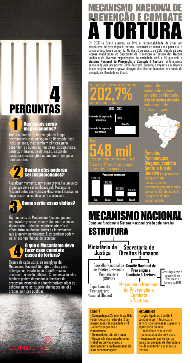 De acordo com levantamento feito pela ONG Conectas Direitos Humanos, os dados fazem da população carcerária do Brasil a quarta maior do mundo, atrás de Estados Unidos, China e Rússia. O grupo protesta contra o fato de não haver dados precisos sobre as práticas de tortura no Brasil e afirma que “o sistema prisional brasileiro é historicamente palco de graves e profundas violações de direitos humanos”.