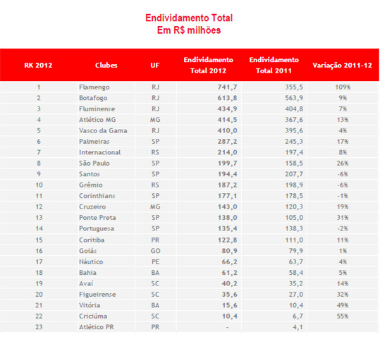 [5] Tabela preparada pela BDO RCS, filial brasileira da empresa de consultoria e auditoria BDO. Disponível em: http://globoesporte.globo.com/platb/olharcronicoesportivo/2013/06/24/o-endividamento-dos-principais-clubes-brasileiros/, último acesso em 10 de setembro de 2013. E http://www.estadao.com.br/noticias/esportes,dividas-dos-principais-clubes-brasileiros-chegam-a-r-47-bilhoes,1037299,0.htm, último acesso em 10 de setembro de 2013.