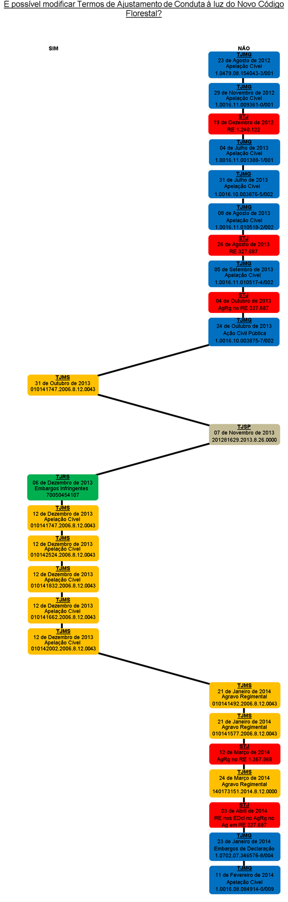 Das 13 decisões de Tribunais de Justiça proferidas em sentido contrário à aplicação da nova lei a acordos ou sentenças em execução, 10 se fundamentam no precedente do STJ e duas são anteriores ao mesmo. Há, portanto, forte evidência de formação de uma linha jurisprudencial (ver figura em anexo) em sentido diametralmente contrário ao disposto no art.12 do Decreto Federal 8235/14.