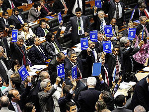 Parlamentares contrários à terceirização protestaram com carteiras de trabalho.