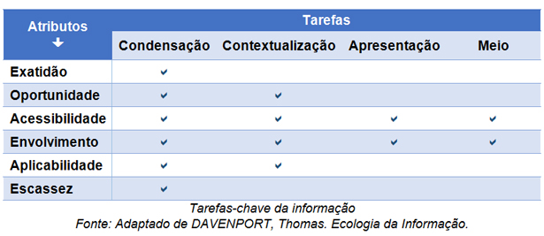 Na primeira coluna tem-se os atributos que agregam valor à informação e nas colunas seguintes as tarefas que, ao serem realizadas, resultam na produção destes atributos.