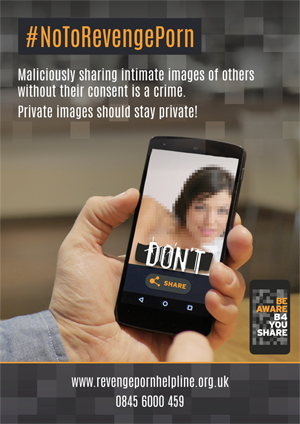 Cartaz diz não à pornografia por vingança: "Compartilhar maliciosamente imagens íntimas de outros sem o seu consentimento é crime. Imagens privadas devem permanecer privadas!".