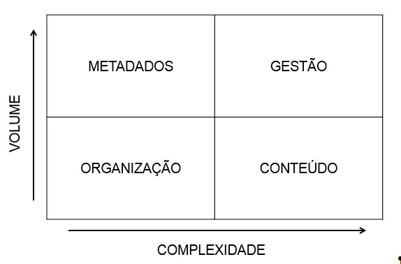Com a visão proporcionada pelo quadro resumo verificam-se desafios que abarcam as três acepções didáticas da informação: os dados, a informação e o conhecimento. O ponto com alta complexidade e grande volume necessitará de abordagens encontradas na Administração chamadas de ‘Gestão do Conhecimento’.