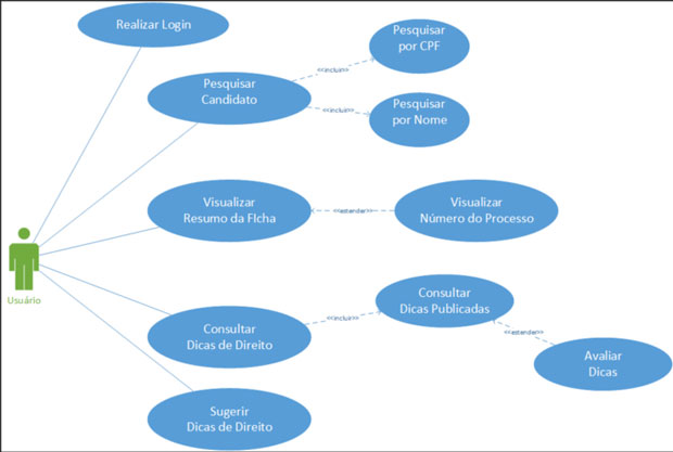 A Figura 3 ilustra as funcionalidades e interação do Usuário com a aplicação. O Usuário deve autenticar-se para utilizar a aplicação. A função pesquisar candidato possibilita o usuário a consultar o partido de filiação do candidato, seu número, proposta de atuação e resumo do patrimônio declarado junto à Justiça Eleitoral. A pesquisa pode ser feita pelo Cadastro de Pessoas Físicas (CPF) ou pelo Nome do candidato, não somente nome completo, mas partes. O Usuário pode visualizar a ficha do candidato, tal funcionalidade está ligada a eventuais processos que o candidato possua. Caso haja interesse o usuário pode visualizar o número do processo e os detalhes do mesmo.
