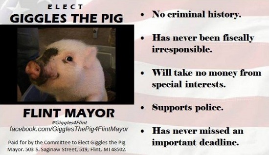 A campanha eleitoral para a Prefeitura de Flint, no estado de Michigan, perdeu a graça depois que, na quinta-feira (11/6), foi retirada a candidatura de Giggles, o porco. A campanha “Giggles, o Porco, para Prefeito de Flint” (“Giggles the Pig for Flint Mayor”) fez um grande sucesso no país e só terminou porque seu objetivo foi cumprido: as autoridades corrigiram erros no processo eleitoral, o que se recusavam a fazer até então.