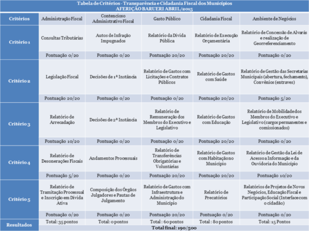Em seguimento às atividades realizadas em março, foi conduzida em abril a aferição piloto do município de Barueri, a fim de testar a viabilidade dos cinco eixos de critérios de avaliação elaborados pelo Conselho Deliberativo da pesquisa. São eles: 1. Administração Fiscal[2]; 2.Contencioso Administrativo Fiscal[3]; 3.Gasto Público[4]; 4.Cidadania Fiscal[5]; e 5. Ambiente de Negócios[6].
