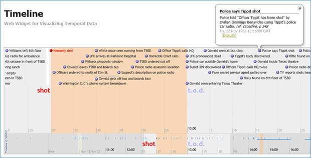 O Instituto de Tecnologia de Massachusetts (MIT), referência mundial em desenvolvimento de tecnologias, desenvolveu já em 2008, o projeto SIMILE de visualização de dados que disponibilizou uma ferramenta livre para a construção de linhas de tempo em sites. Um dos exemplos apresentados no projeto é a distribuição temporal de dados minuto a minuto do dia do assassinato do Presidente Kennedy. Na figura abaixo, é possível ver um pedaço desta linha do tempo, notem que é possível clicar em um ponto e receber mais informações sobre ele, inclusive aceitando a inserção de fotos.