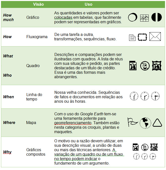 Com base nestes quesitos, é possível identificar qual peça gráfica pode ser utilizada para sua demonstração visual. A inovação do livro não é a descoberta das técnicas, mas sim a ligação de cada abordagem com uma rápida pergunta básica. Não é novidade que o aspecto temporal (When) possa ser demonstrado em uma linha do tempo, como foi visto na coluna da semana passada.