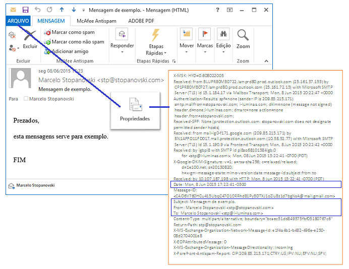 Na mensagem aberta acessa-se "Arquivo" e depois "Propriedades", então o cabeçalho da mensagem exibe todas as transações entre os computadores servidores dos provedores de e-mail e as identificações de cada máquina (IP), sendo os reais metadados do e-mail. Aqui eles são apresentados de forma sintetizada.