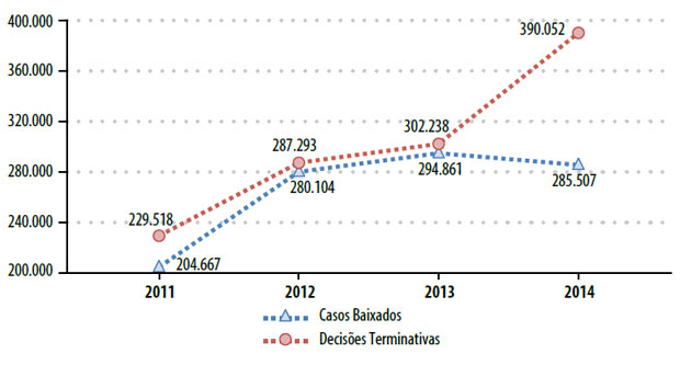 De acordo com a pesquisa, o STJ entrou em 2014 com um estoque de 351,4 mil processos, mas fechou o ano anterior com 314 mil feitos pendentes. Ao mesmo tempo, o número de processos baixados caiu 3,2% de um ano para o outro. Isso se explica pela “diminuição da produtividade” tanto dos ministros quanto dos servidores, segundo o CNJ.