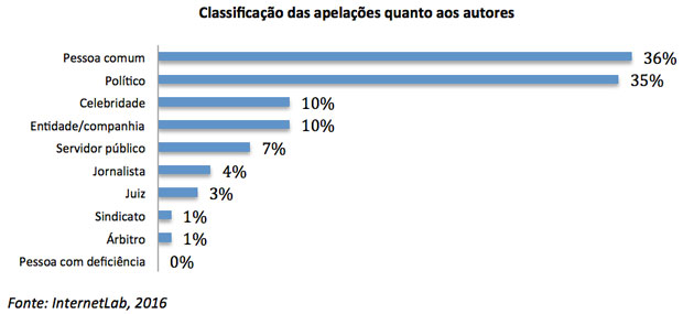 Alguns dados preliminares da pesquisa foram divulgados no último dia 9 de agosto, em Brasília, no Fórum Abril-Google de liberdade de expressão, que contou com a participação dos excelentíssimos ministros Gilmar Mendes (STF), Henrique Neves (TSE) e Ricardo Villas Bôas Cueva (STJ). No caso das apelações, chama a atenção o fato de 1/3 das ações terem sido promovidas por membros da classe política, especialmente se se considerar que não foram analisados casos da Justiça Eleitoral: