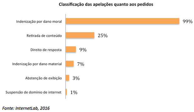 Em relação aos pedidos, a indenização por dano moral é pleiteada em praticamente todas as ações, o que também se relaciona com os principais fundamentos apresentados: o direito à honra (78%) e à imagem (78%). Isso porque a Constituição Federal, em seu artigo 5º, inciso X, assegura o direito à indenização no caso de violação desses direitos. Da mesma forma, garante a livre manifestação do pensamento (artigo 5º, inciso IV).