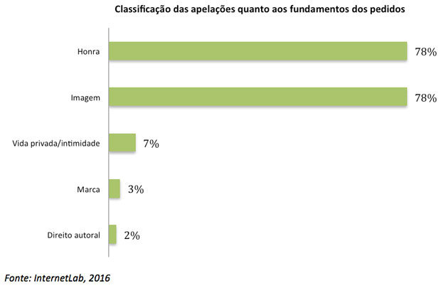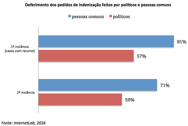 Os resultados das apelações analisadas sugerem que o Poder Judiciário ainda é muito leniente em relação aos pedidos de indenização por dano à honra e imagem, o que significa que, a rigor, no sopesamento entre liberdade de expressão e esses direitos, os últimos prevalecem. No grupo das ações propostas por pessoas comuns, em 71% das apelações julgadas, a indenização por dano moral é concedida; em 81% dessas ações a indenização foi concedida em primeira instância. Os números não são tão diferentes como deveriam em relação às ações propostas pela classe política: em 50% das apelações julgadas, os políticos foram indenizados; em quase 60% dessas ações (que chegaram à segunda instância), a indenização foi concedida em primeira instância.