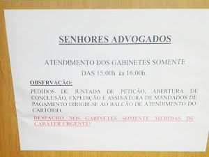 A placa improvisada em papel sulfite na entrada dos gabinetes 1, 2 e 3 — das juízas Kátia Nascentes Torres (titular), Cristiana Aparecida e Juliana Benevides — apontava que os advogados só seriam recebidos de 15h às 16h. O aviso também dizia que os despachos com as juízas deverão ser feitos apenas para "medidas de caráter urgente".