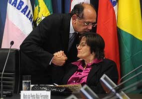 Ministro Gilmar Mendes cumprimenta Maria da Penha, que ficou paralisada após agressões do marido. Ela deu nome à lei de proteção às mulheres.