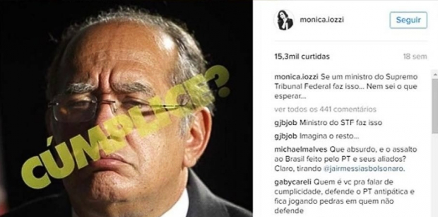 A pergunta "Cúmplice?" escrita sobre a imagem do ministro do Supremo Tribunal Federal Gilmar Mendes foi o que motivou o juiz Giordano Resende Costa, da 4ª Vara Cível de Brasília, a condenar a atriz Monica Iozzi a indenizar o ministro em R$ 30 mil.