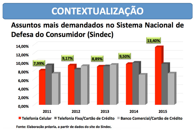 O estudo feito pelo TCU mostra que a telefonia celular é o assunto com mais demandas no Sistema Nacional de Defesa do Consumidor. Em 2015, a área foi responsável por 13,4% das reclamações, ficando à frente de problemas com telefonia fixa, cartões de crédito e bancos.