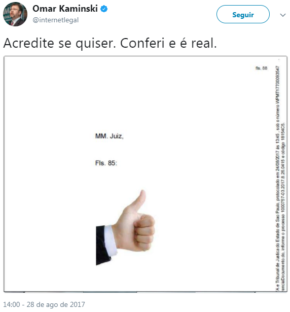 Faltaram palavras para o advogado Luiz Ronaldo da Silva confirmar o cumprimento de um acordo entre seu cliente e uma companhia aérea. Em resposta ao cartório do Juizado Especial Cível de Palmital (SP), o advogado optou pela linguagem não verbal: um singelo, mas categórico "joinha" encerrou a questão. O achado é do advogado Omar Kaminski, que coordena o site Observatório do Marco Civil da Internet.