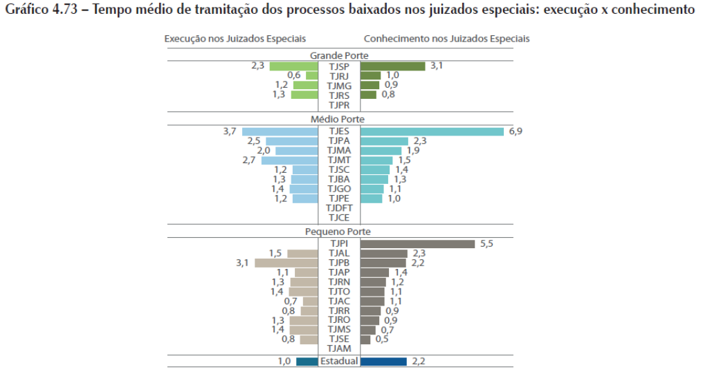 O mesmo relatório ainda demonstra que o tempo médio para a prolação de sentença na fase de conhecimento nos juizados especiais estaduais é de nove meses:
