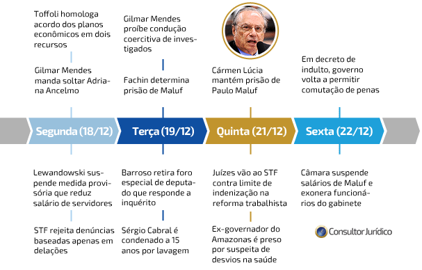 A semana teve ainda a prisão do deputado Paulo Maluf (PP-SP), depois que o ministro Edson Fachin determinou o cumprimento imediato da pena de 7 anos, 9 meses e 10 dias de reclusão por lavagem de dinheiro desviado quando era prefeito de São Paulo, entre 1993 e 1996. A defesa recorreu ao STF, mas a ministra Cármen Lúcia considerou a estratégia protelatória.