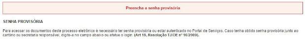 Aviso padrão no site do TJ-RJ, exigindo a obtenção de uma senha provisória.
