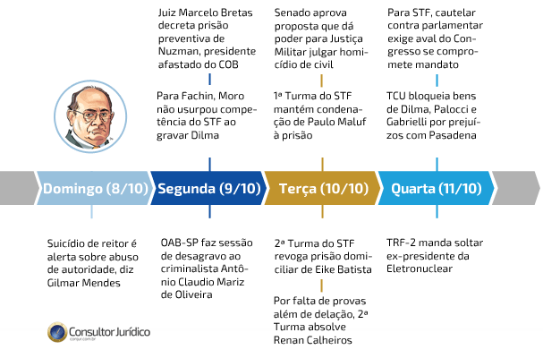 Ficou em segundo lugar no ranking, com 94,3 mil acessos, a notícia sobre o alerta que o ministro Gilmar Mendes fez a respeito do suicídio do reitor da Universidade Federal de Santa Catarina Luiz Carlos Cancellier. Para o ministro, o caso mostra problemas do abuso de autoridade. “Não estou antecipando responsabilização, mas o caso demonstra que, algumas vezes, sanções vexatórias são impostas sem investigações concluídas”, declarou em sua conta no Twitter.
