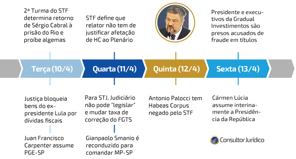 A semana começou com a repercussão da prisão do ex-presidente Lula, que se entregou no dia 7 de abril, e novo pedido da defesa (embargos de declaração em embargos de declaração). Fora do cenário político, foi relevante o entendimento da 1ª Turma do Superior Tribunal de Justiça que manteve a TR como índice de atualização das contas do Fundo Garantia.