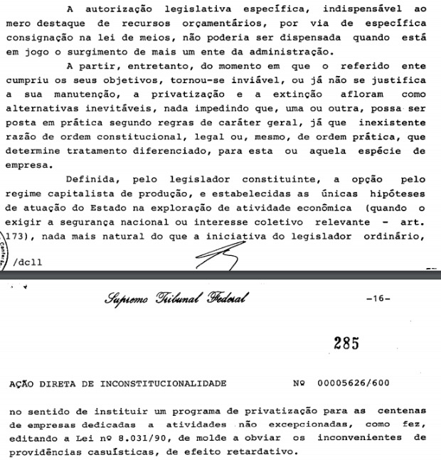 De igual modo, há outros julgados no STF no sentido de que o PND também é uma autorização legislativa suficiente para iniciar uma privatização. A ADI 562, de relatoria do ministro Ilmar Galvão, é a ação na qual foi fixada a posição na corte:
