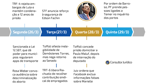 O noticiário político destacou durante a semana a concessão de prisão domiciliar ao deputado federal Paulo Maluf (PP-SP), que foi internado na terça-feira (27/3) com fortes dores nas costas. A ConJur informou que, por trás do caso concreto, a liminar do ministro Dias Toffoli reconheceu a impetração de pedido de Habeas Corpus contra ato de ministro do Supremo Tribunal Federal.