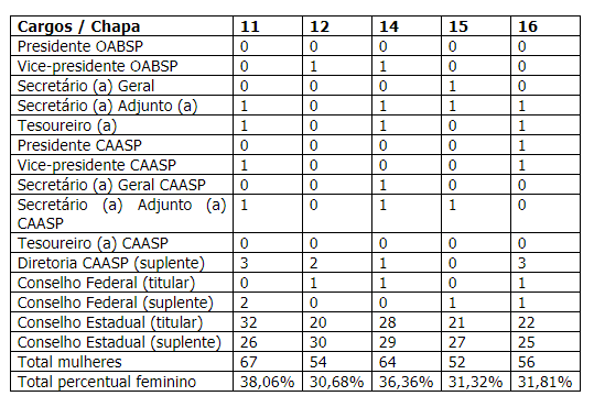 Na seccional São Paulo todas as chapas tiveram mais de 30% de mulheres em suas composições, conforme quadro a seguir: