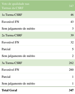 O instituto sempre foi usado com parcimônia e sua legitimidade jamais havia sido contestada pelos contribuintes. No entanto, há pelo menos quatro anos a solução das controvérsias pelo voto de qualidade tornou-se um lugar-comum naquele tribunal administrativo. Estudo realizado pelo NEF/FGV[4], que engloba os julgamentos realizados pela CSRF no lapso temporal compreendido entre 2015 e junho de 2016, constatou que o voto de qualidade foi proferido em 347 oportunidades e em nenhuma delas a decisão foi totalmente favorável aos contribuintes, como se lê no quadro abaixo: