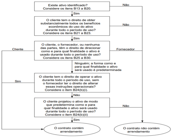 “Na celebração de contrato, a entidade deve avaliar se o contrato é, ou contém, um arrendamento. O contrato é, ou contém, um arrendamento se ele transmite o direito de controlar o uso de ativo identificado por um período de tempo em troca de contraprestação. Os itens B9 a B31 estabelecem orientação sobre a avaliação se o contrato é, ou contém, um arrendamento.”