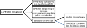 A partir do gênero contratos coligados (contratos coligados lato sensu) seria possível diferenciar: (a) os contratos coligados em sentido estrito; (b) os contratos coligados por cláusulas expressas; (c) os contratos conexos.