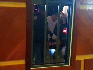 À porta do hospital, ele é amparado e auxiliado a levantar-se para entrar na viatura. Nesse momento cercam-no vários policiais fortemente armados, vestidos com trajes típicos de operações especiais. Abre-se a mala da viatura e ali é “depositado” o interno, que, em notório esforço, curva-se todo para poder caber no compartimento, utilizado, em automóveis quaisquer, para o transporte de objetos em geral.