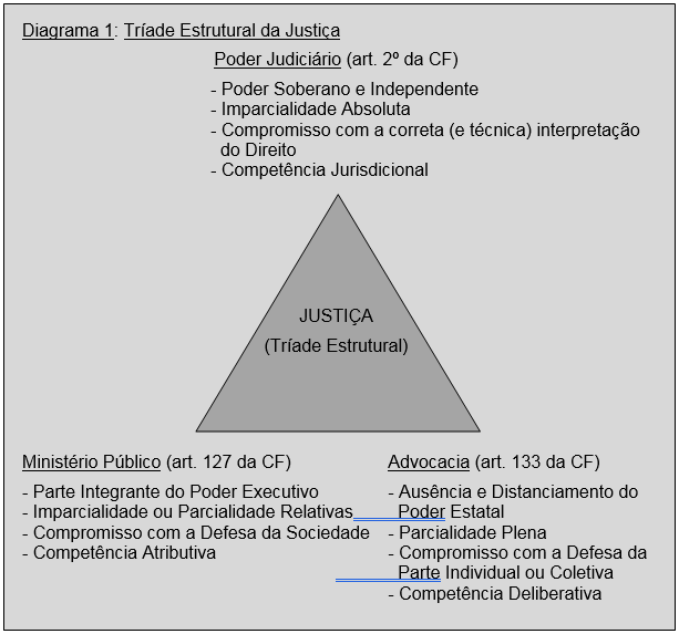 A exemplo do que ocorre no âmbito do poder estatal — que se encontra dividido, em seu exercício funcional, em Executivo, Legislativo e Judiciário —, a sinergia estrutural da tríade basilar da Justiça fundamenta-se não somente no Poder Judiciário, mas, em igual medida, no necessário contrapeso exercido pelo ministério privado da advocacia e pelo parquet, com seus promotores e procuradores de Justiça.