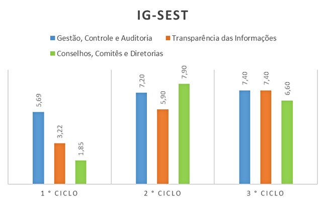 Foi grande o impacto da Lei das Estatais na qualidade de administradores das estatais federais, tal como mensurado pelo Índice de Governança (IG-SEST), elaborado pelo Ministério de Economia a cada seis meses. Na dimensão “Conselhos, Comitês e Diretoria” (uma das três que compõem o índice, como se vê no quadro abaixo), entre o primeiro ciclo de publicação (novembro de 2017, com 46 estatais) e o terceiro (novembro de 2018, com 54), a média das notas atribuídas subiu de 1,85 para 6,60.
