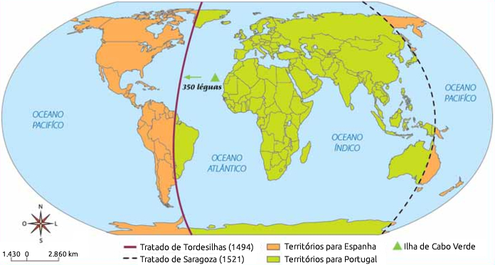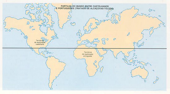Pelo Tratado de Tordesilhas, o mundo a ser descoberto é dividido entre os dois países, por meio de uma linha imaginária que corta o oceano pela metade, entre dois pontos: Cabo Verde (território português) e o Caribe (ilhas descobertas pela Espanha). Essa linha meridiana passaria, portanto, na metade do caminho, a cerca de 370 léguas a oeste de Cabo Verde. A parte oeste daquela linha pertenceria a Espanha, e a parte leste, à Portugal. Os espanhóis não se importam muito com a exigência portuguesa, pois sabiam que as descobertas de Colombo se localizavam muito além daquela marca.