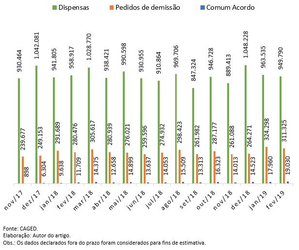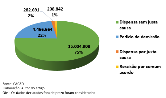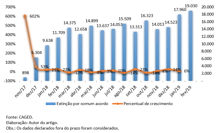 É que de fato houve uma “explosão” de casos de términos de contratos de trabalho por acordo, mas exclusivamente entre os meses de novembro e dezembro de 2017, justamente no início da vigência da reforma trabalhista. Nesse período, a novidade alcançou 602% de crescimento, mas, logicamente, isso somente ocorreu porque até então a modalidade não era prevista em lei, ou seja, qualquer ocorrência representaria aumento significativo para fins estatísticos. O “crescimento” naquele período específico, portanto, não pode ser utilizado para demonstrar que os empregadores se utilizaram da alternativa para fraudar a legislação trabalhista, pois, quando comparamos a ocorrência das modalidades de término de contrato de trabalho, aquelas por acordo não representam sequer 1% do total.